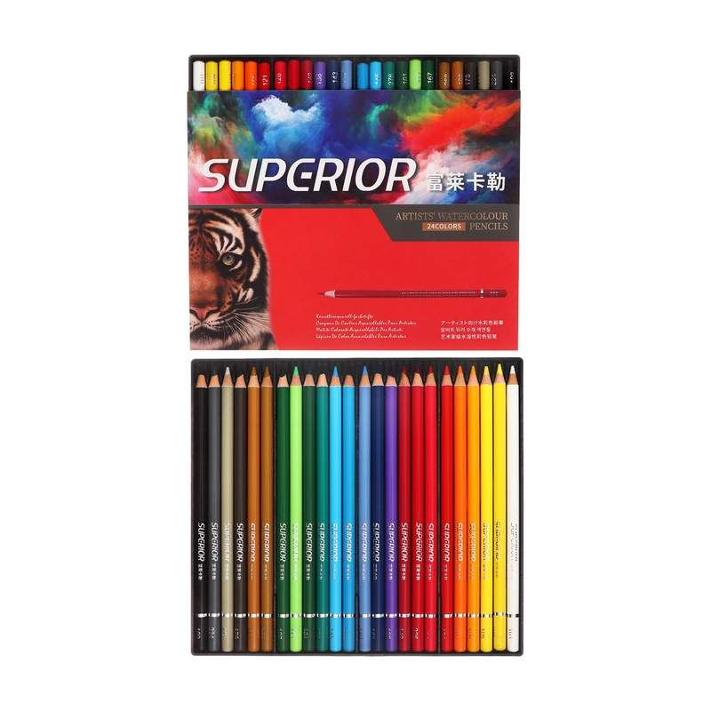 Set de 24 crayons aquarelle Superior, pigments intenses et solubles à l’eau. Idéal pour illustration, dégradés, techniques mixtes et coloriage artistique. Pour débutants et artistes.