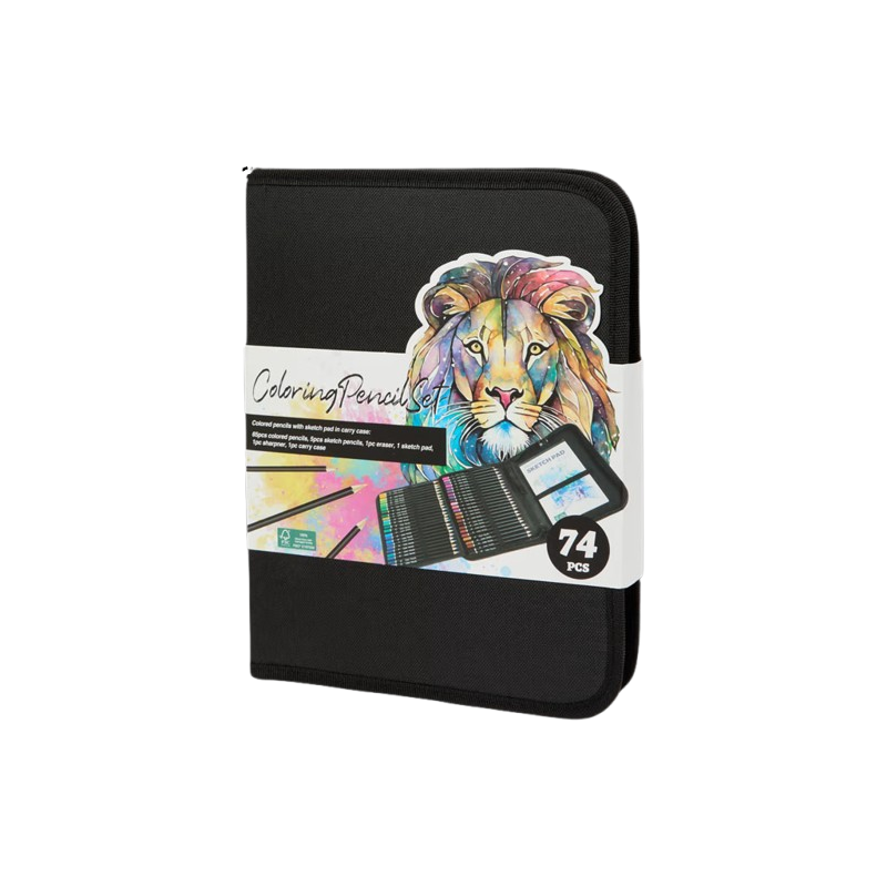 Contenu : 65 crayons de couleur, 5 crayons graphite, 1 gomme, 1 taille-crayon, 1 bloc à dessin
